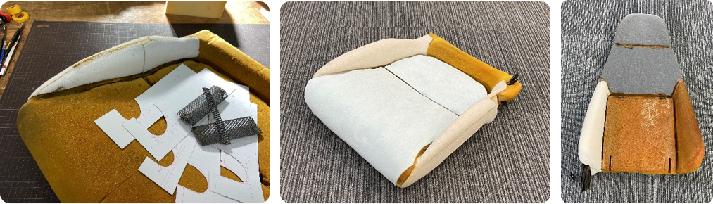 シートカバーを外し、切れたりヘタったウレタンを改修補強して、新しいトリムカバーを組付けます。